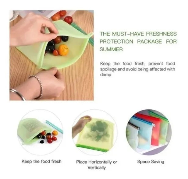 Fabricadas de silicona sin BPA para no alterar el sabor, tienen un cierre para evita que los alimentos entren en contacto con el aire, el agua, la humedad o los insectos. Esto ayuda a conservar la frescura, el sabor y la textura de los alimentos, puedes usarlas para guardar alimentos en el refrigerador, congelador o alacena.